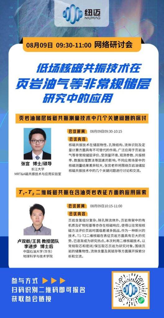 为给能源领域的学者们提供新的研究思路,纽迈分析特邀请了两位专家就低场核磁共振技术在页岩油气等非常规储层研究中的应用进行汇报。希望专家们的报告能让大家对低场核磁技术在油气勘探开发方面有更深层次的了解,也希望通过此次网络研讨会,大家一起相互交流分享,碰撞出思想的火花。