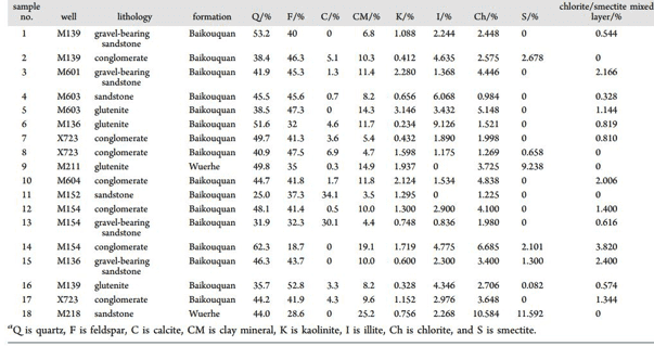 本文制备了18组取自新疆油田砂砾岩储层的样本(表1),将每组样本分为六份,分别进行了X射线衍射(XRD)、铸体薄片、扫描电镜(SEM)、低温氮气吸附(LTNA)、高压压汞(HPMI)和NMR测试,其中NMR测试通过纽迈公司生产的MesoMR3-060H-I核磁共振仪进行。