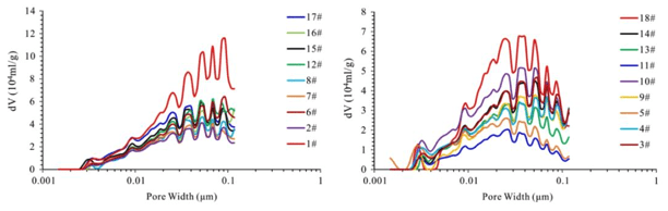 通过DFT模型获得的砂砾岩孔径分布曲线见图4。曲线呈左半峰或单峰形态,主要分布在大于0.02μm的部分。