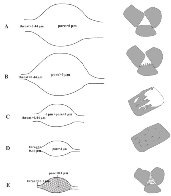 图9 砂砾岩中发育的五种主要的孔喉结构