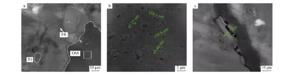 对来自涪陵龙马溪组页岩岩心(H8)进行高分辨率FIB-SEM观测,识别孔隙类型。下图显示页岩中细粒矿物粒间孔隙(无机孔)、有机孔及微裂缝分布。3种孔隙具有不同分布范围:有机孔尺寸小,为纳米级别,细粒矿物粒间孔隙为微米-纳米级别,微裂缝尺寸较大,为微米级别。