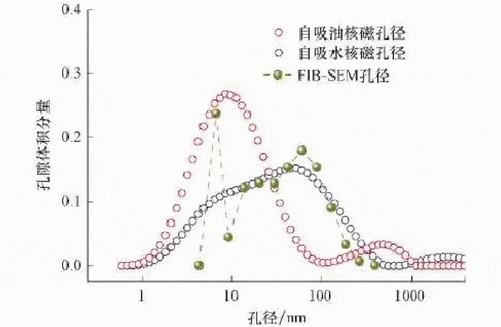这种分布与核磁T2谱三峰分布具有一致性。下图核磁孔径分布是采用公式转换得到,其结果与利用扫描图像确定的孔径分布吻合。进一步证明,利用核磁共振技术识别与评价页岩有机孔和无机孔是可行的。