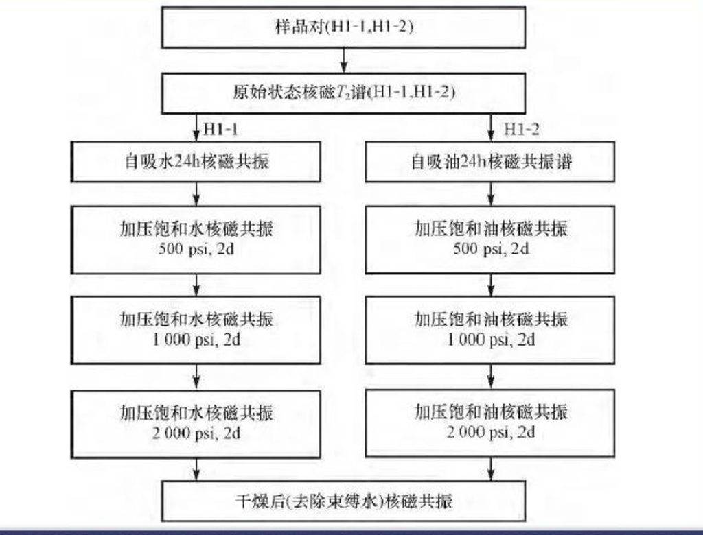 为识别有机孔与无机孔T2谱峰位置,将同一深度点的柱样分成两部分,分别在饱和盐水和油(正十二烷)条件下进行T2谱测量,具体步骤如下图所示。