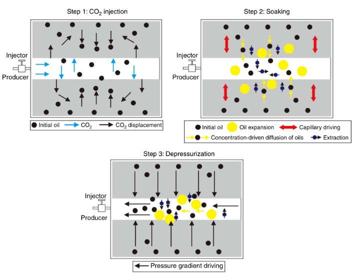 浸泡阶段: 在此过程中注入的CO2进一步扩散到岩石基质中,并溶解在基质油中,此时以萃取作用和溶解作用为主,溶解的CO2导致局部高压,从而将油驱向裂缝。