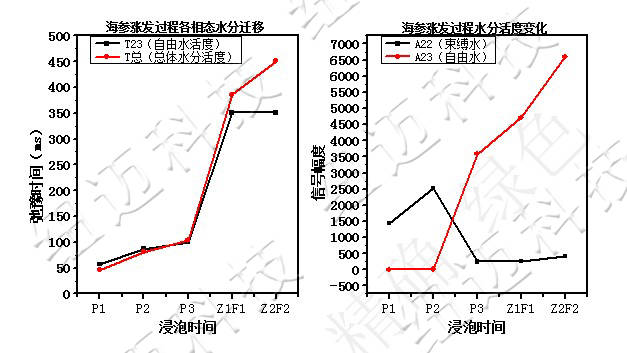 海参浸泡初期外界水主要进入海参内部转化为细胞内水,束缚水(A22)含量增大;浸泡时间增加,海参内部结构不断膨胀,束缚水(A22)逐渐向自由水(A23)迁移。随着外界水的进入,海参结构涨发,海参体内水的活度不断增大。