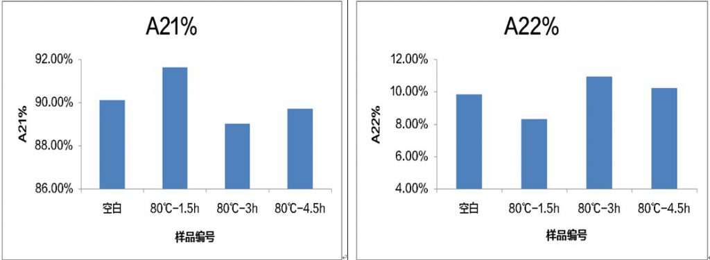 四个样品中水分都主要以结合水形式存在,水的自由程度都很低,表现出来的横线弛豫时间很小,且样品80℃-1.5h的结合水比例略小于其他组样品。
