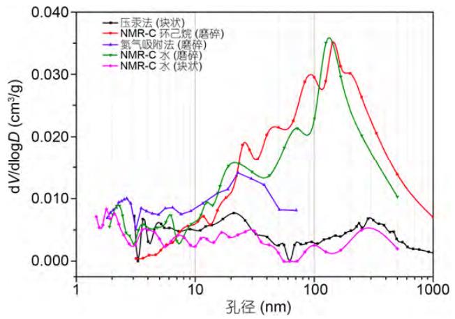 常规的核磁共振弛豫法不能反映孔隙的绝对孔径,需要进行系数换算得到孔径分布。而核磁共振冷冻测孔法不但具有常规核磁共振技术的优势,还能提高微孔、中孔的测试精度,测试范围也能满足低渗页岩的需求。