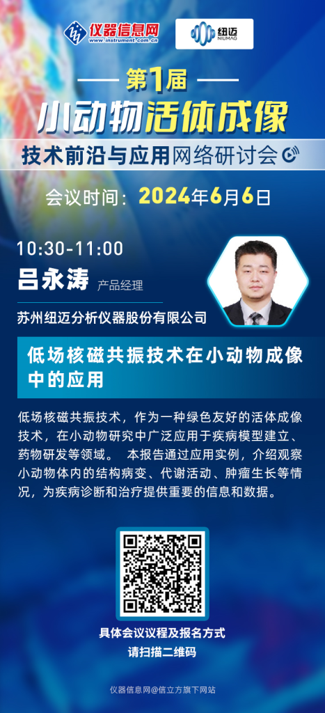 iSAI2024重磅线上首发,为期一天,第一届小动物活体成像技术与前沿应用主题网络研讨会将于6月6日在线开播,十余位特邀嘉宾共话小动物活体成像技术。作为本次研讨会的特邀嘉宾之一,好博网页版登录入口将带来精彩的演讲,介绍低场核磁共振技术在小动物成像领域的应用进展和实际案例