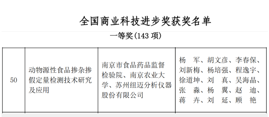 日前,“2022年度中国商业联合会科学技术奖”正式发布评选结果。苏州纽迈分析联合南京市食品药品监督检察院和南京农业大学共同申报的“动物源性食品掺杂掺假定量检测技术研究及应用”项目,斩获中国商业联合会科技奖一等奖。