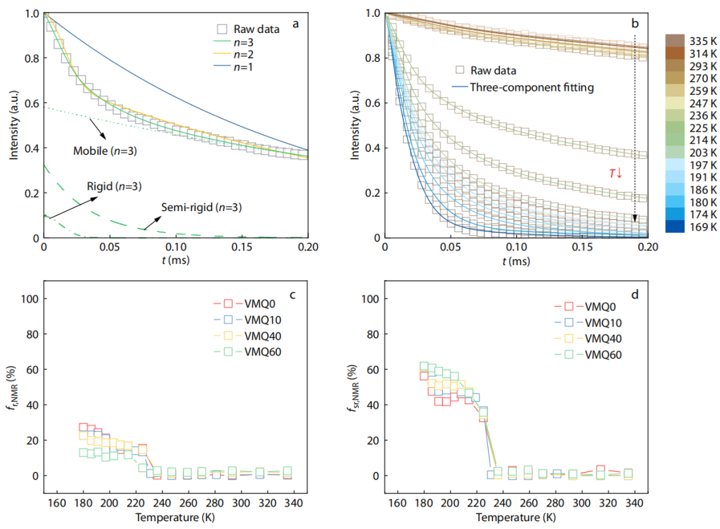 如图c和d所示的拟合结果表明,VMQ/SiO2在Tm(熔点:228K)以下的刚性分数(fr,NMR)发生突变,且超过30%。在180 K的半刚性区域也观察到了类似的趋势,半刚性的组分差不多在60%。