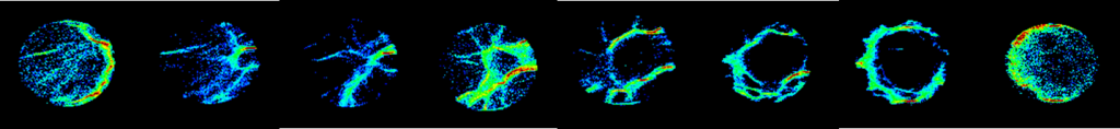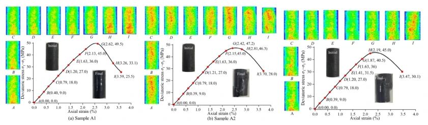 图一三个样品峰值强度分别为49.5、47.2和45MPa,最大应变分别为3.59%、3.7%和3.47%。核磁成像表征了样品在加载过程中含水量的空间分布,暖色程度越高水含量越高。