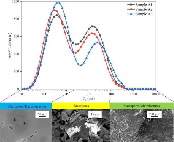 图二为静水压力煤样T2谱。借助核磁弛豫技术对空隙进行分类:左边的弛豫值(T2<2.5ms)对应于微孔和过渡孔隙,中间的弛豫值(2.5<T2<100ms)对应中孔,右边的弛豫值(T2>100ms)对应大孔孔隙和微裂缝。