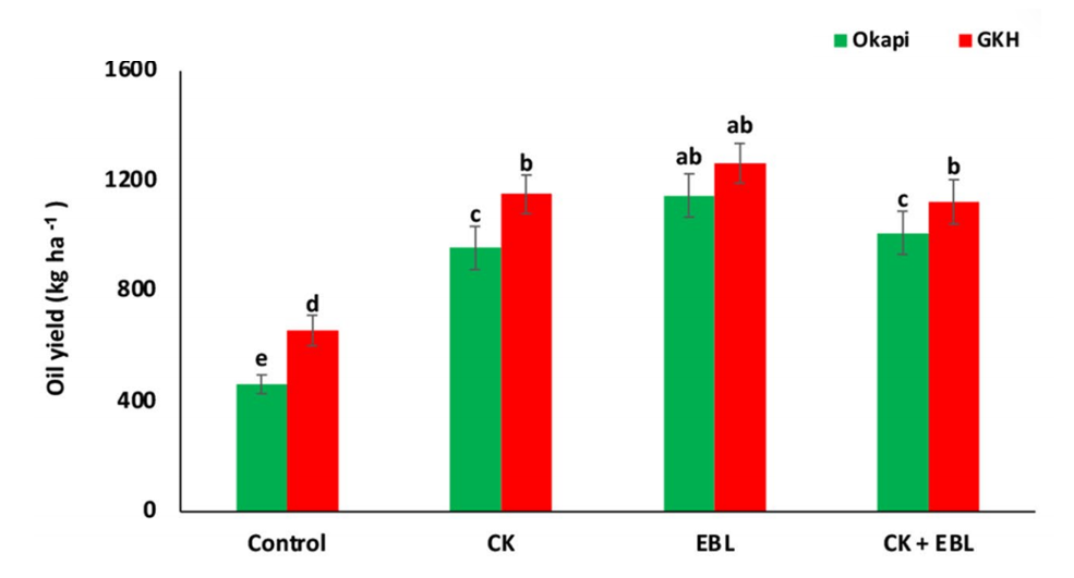 在相同处理和灌溉水平下,GKH 品种的油产量整体高于 Okapi 品种。这体现了不同油菜品种在产量潜力上存在差异,GKH 品种可能具有更好的生长特性或对激素处理的响应机制,使其在油产量上表现更优 。