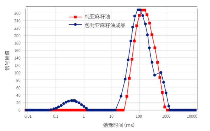 一份包封后的亚麻籽油成品,以及一份原料亚麻籽油(由苏州本地一家实验室购买,确保包封的亚麻籽油与原料亚麻籽油是同一批次)。通过低场核磁共振设备检测,其弛豫时间相关谱如下: