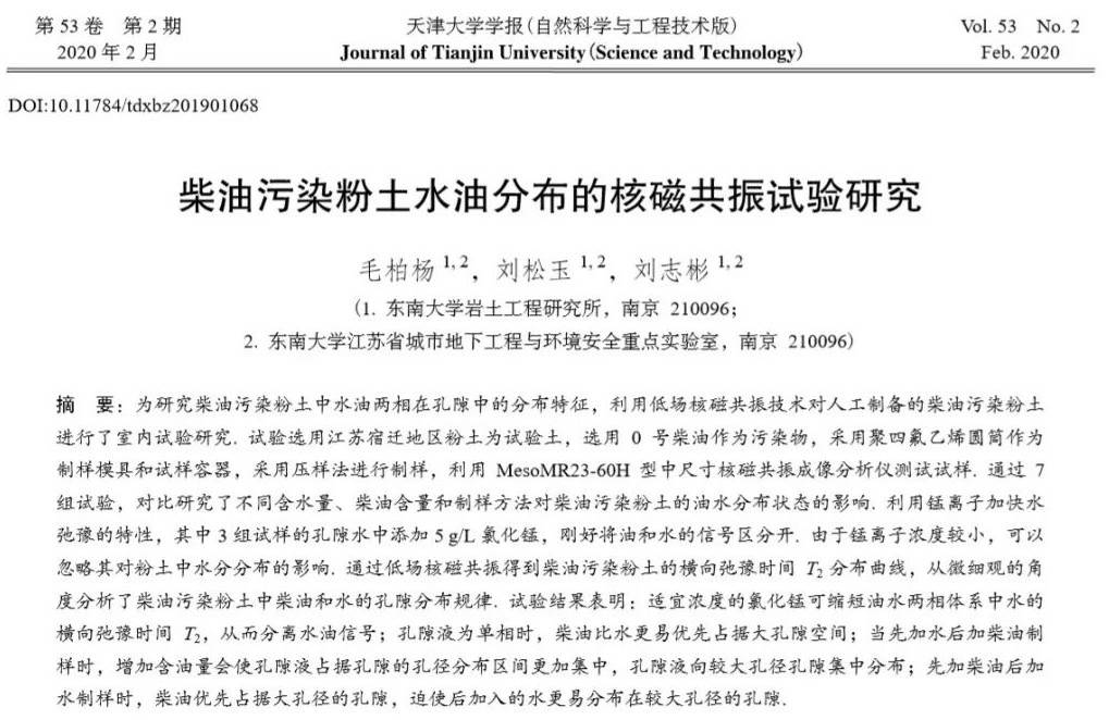 大家好,今天小编精挑细选了一篇在2020年2月刚刚出版在《天津大学学报》上的一篇文章,利用核磁共振技术研究柴油污染粉土中水油在孔隙中的分布规律,研究过程并不复杂,但结果很有意思,希望对大家有所帮助!