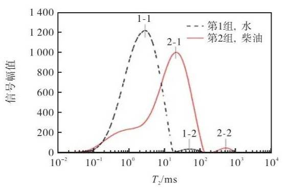 单体系中,柴油比水更易占据较大孔隙   如图2所示,1和2分别是仅有水或者柴油的试样。明显看出,第 1 组试样的 T2 分布区间主要集中在 0.1~10.0ms;第 2 组试样的 在T2分布区间主要集中在 0.1~100.0ms且0.1ms附近较少;弛豫时间与对应孔隙的孔径成正比(核磁共振测试孔径分布的原理),0.1~10.0ms 对 应孔径较小的孔隙,10.0~100.0ms 对应孔径较大的孔隙,因此我们可以得出:单体系中,柴油比水更容易占据较大孔隙。