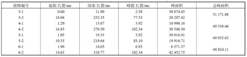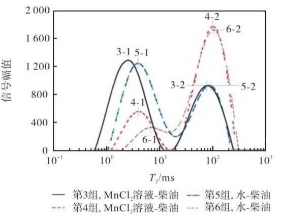 4 组试样较第 3 组试样的 T2 区间小,并且区间的左端点右移,第 6 组试样和第 5 组试样相比也有相似的变化规律。此外,第 4 组和第 6 组的第 2 峰面积在总峰面积中的占比远大于第 3 组和第 5 组。  以上说明,在 MnCl2 溶液-柴油体系和水-柴油体系中,当含水量不变时,柴油含量的增加使流体在试样孔隙中的孔径分布空间更加集中,表现为向大孔径孔隙分布的趋势,导致孔隙油分布变化的原因主要是含油量增加导致孔隙油分布形态发生变化。