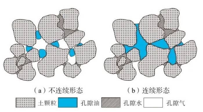 究其原因,在多孔介质中, 非水相液体(NAPLs)可能赋存形态为不连续形态和连续形态(图 5)。其中当 NAPLs 的含量超过残余饱和度时,NAPLs 更多地以连续形态存在,但不会占据所有大孔隙空间。粉土中的柴油作为非浸润液体,可能因为含油率的增加,小孔隙油(如图 5(a)所示)合并为大孔隙油(如图 5(b)所示),分布在大孔隙中。  03