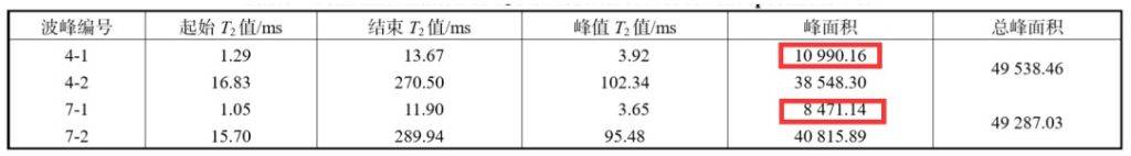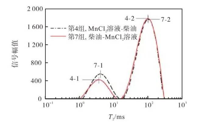 第 4 组和第 7 组试样的总峰面积几乎相等,这说明配制的样品是可靠的。进一步分析发现,发现第 7 组的第 1 峰面积略小于第 4 组的第 1 峰 面积。  相应地,第 7 组的第 2 峰面积略大于第 4 组的 第 2 峰面积.由于第 2 峰主要由柴油的核磁信号构 成,第 1 峰主要由 MnCl2溶液的核磁信号构成,因此,相较于制样时第 1 相为水的情况,第 1 相为柴油时,柴油优先进入较大孔径的孔隙,后加入的水更多地进入大孔径的孔隙。